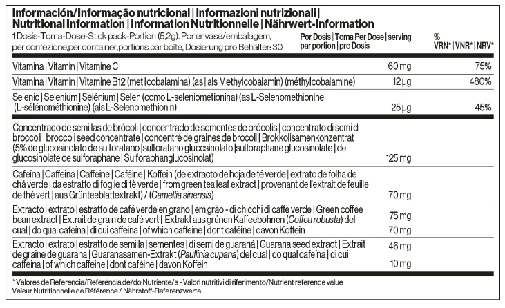 Formulado con una base de sulforafano y selenio, activadores de Nrf2 altamente eficaces, y mejorado con tres fuentes naturales de cafeína, este complemento es una alternativa energética que, no solo contribuye a regular las proteínas antioxidantes para proteger contra el daño oxidativo, sino que también proporciona una energía duradera para enfrentarte a tu día. Siente el efecto en solo 15 minutos, con una duración de hasta 6 horas.