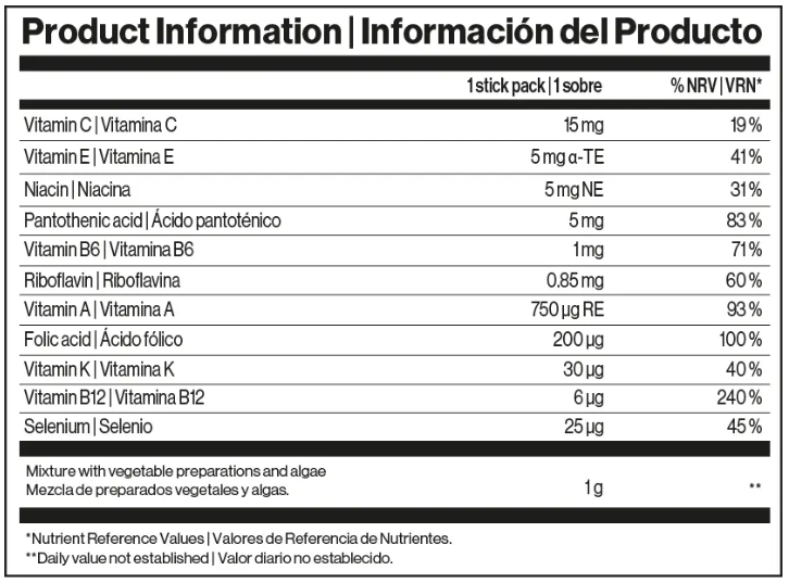 Una mezcla de más de 50 frutas y verduras orgánicas que incluye: zanahoria, manzana, col rizada, brócoli, espinaca, perejil, col verde, arándano, frambuesa, fresa, tomate, ciruela, cáscara de naranja, fibra de manzana, hoja de té verde, cereza, acai, granada, plátano , baya de goji, grosella negra, saúco, uva, piña, papaya, durazno, mora, limón, pera, camote, arándano, calabaza, col verde y naranja… solo por mencionar algunos.